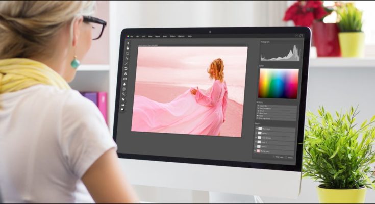 Artista de design gráfico que usa Adobe Photoshop em um Mac.