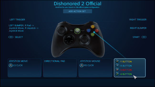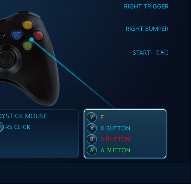 Steam offers many different options for configuring groups of buttons, joysticks, touchpads, or directional pads. For example, you could make the four buttons on the Xbox 360 controller function as a joystick, scroll wheel, or rato. But, if you just wanted to change what the Y button does, you’d just select the “Y” button here.