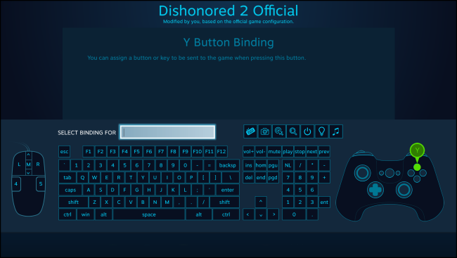 Steam allows you to select any keyboard or rato button the controller button you selected should function as. You can even use multi-button keyboard shortcuts.