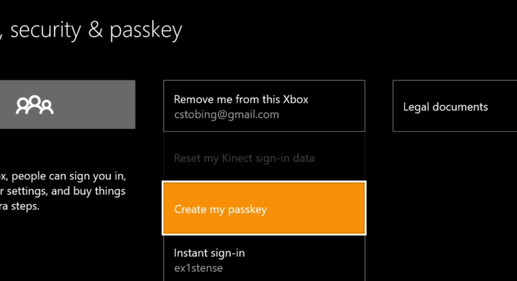 Aqui você verá várias opções, incluindo remover seu e-mail associado a esse Xbox, ativar (ou desativar) o login instantâneo e a opção de criar uma nova chave de acesso.
