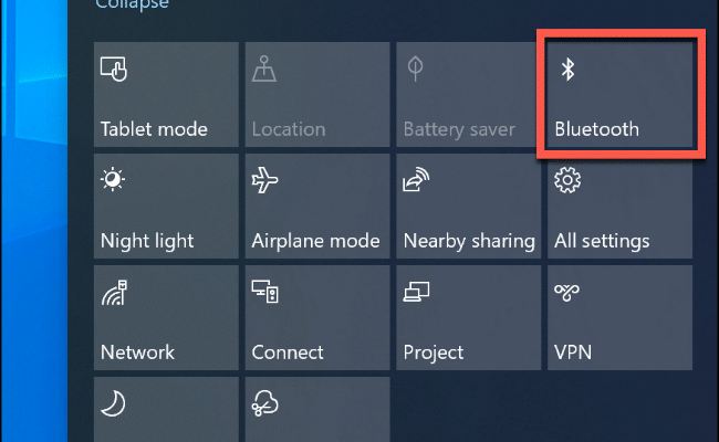 Para verificar isso, clique no ícone de notificação do Windows na barra de tarefas no canto inferior direito da tela. Se você não vir um bloco “Bluetooth”, clique no botão “Expandir”. Se o bloco “Bluetooth” estiver acinzentado, o rádio Bluetooth está desligado.