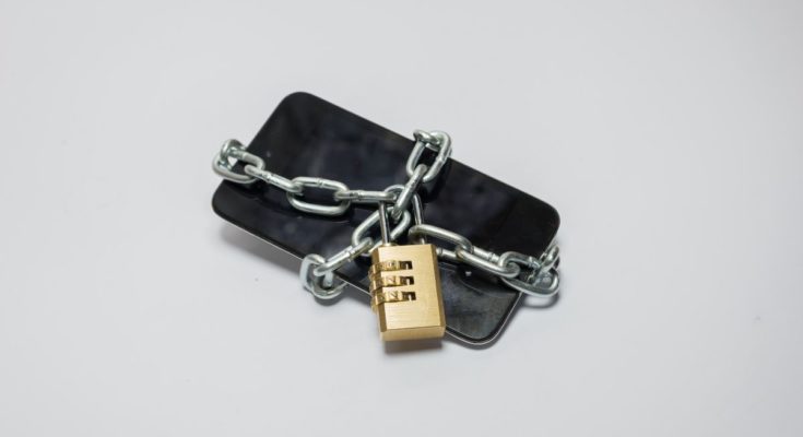 Smartphone enrolado em uma corrente de metal com um cadeado que o protege.