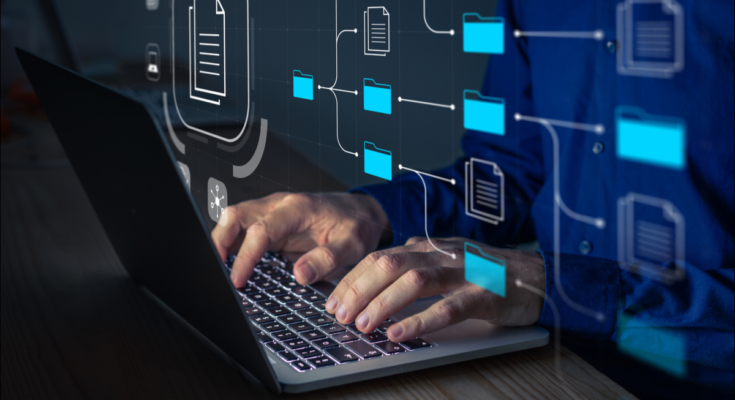 Ilustração de um sistema de gerenciamento de documentos flutuando sobre um laptop aberto