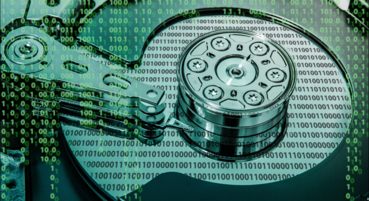 Uma unidade de disco rígido com código binário escrito sobre ela.