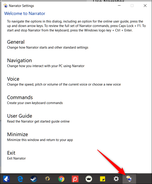The Narrator options in the Settings app should let you configure Narrator pretty well. However, you can also open its legacy settings window if you want to dig a little deeper and more fully customize Narrator. When Narrator is running, you can click its icon on the taskbar (or Alt+Tab to it) to open the Narrator Settings window.