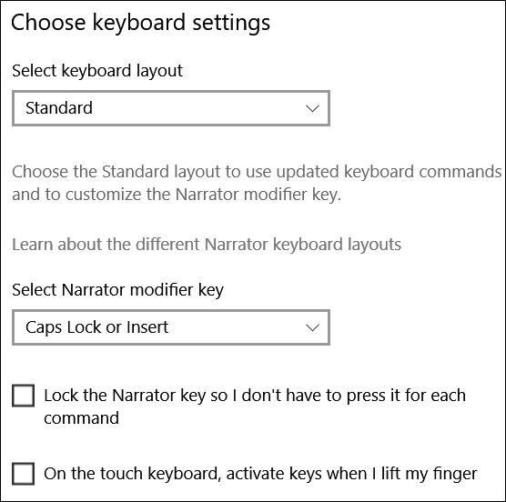 Esta seção contém controles para escolher entre um layout de teclado Padrão e Legado. O layout padrão, que é a configuração padrão, permite que tu use comandos de teclado atualizados e permite personalizar a tecla modificadora do Narrator (usando a tecla Insert em vez da tecla CapsLock). Funciona mais como outros aplicações de leitura de ecrã. O layout Legado funciona mais como o Narrator nas versões anteriores do Windows. tu pode ler mais sobre os diferentes layouts na página de Suporte da Microsoft .