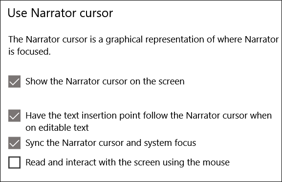 You can enable/disable the Narrator cursor, choose whether or not to move the system cursor along with the Narrator’s cursor, sync the Narrator and system focus, and enable Narrator to read and interact using the rato.