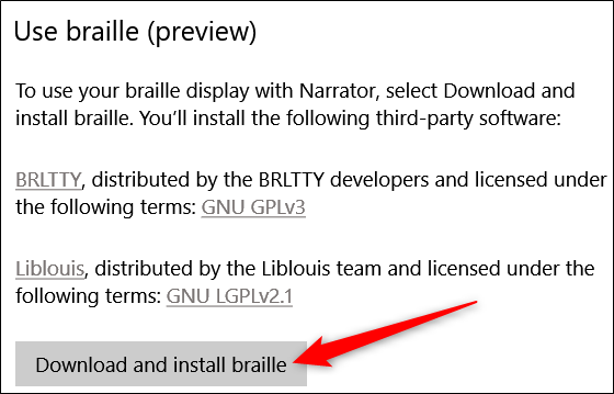 Using a braille display with Narrator requires some third-party applications. You can download those by clicking the “Download and Install Braille” button.