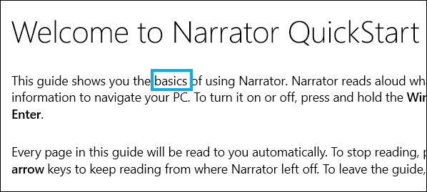 Depois de habilitar o Narrator, tu será saudado pela janela QuickStart, que lhe dará um breve resumo de como usar o Narrator e mostra algumas de suas funções e comandos para tu começar. Ele aparecerá toda vez que tu iniciar o Narrator, a menos que tu clica na caixa no canto esquerdo inferior. O Narrator também começa imediatamente a ler o texto da janela para tu.