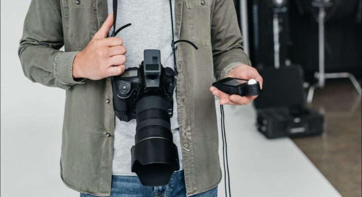 Fotógrafo usando medidor de luz em estúdio fotográfico