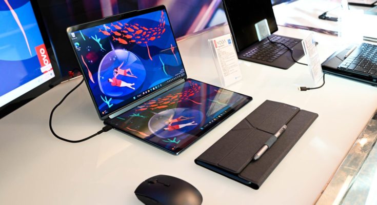 Lenovo Yoga 9i e fique em cima de uma mesa.