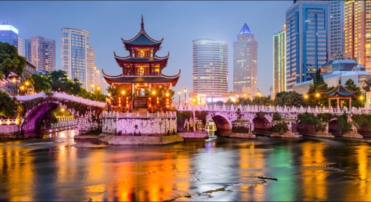 O horizonte de Guiyang, China, no Pavilhão de Jiaxiu no Rio Nanming.