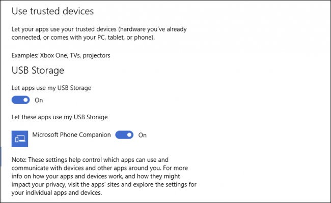 Abaixo, há uma seção para dispositivos confiáveis ​​(dispositivos que tu já conectou ao seu PC, tablet ou telefone) e uma opção para evitar que os aplicações usem o armazenamento USB. Novamente, tu pode escolher quais aplicações podem usar o armazenamento USB, se houver.