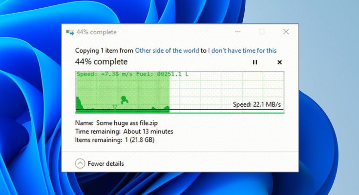 O usuário do GitHub Sanakan8472 criou o Copy Dialog Lunar Lander, um jogo sobreposto ao gráfico de transferência de arquivos na caixa de diálogo de cópia do Windows. O arquivo leia-me do projeto explica: “aqui está uma das questões mais urgentes de nossos tempos: você precisa baixar um arquivo enorme do outro lado do mundo para continuar seu trabalho. Você literalmente não pode fazer nada além de esperar. Agora há é finalmente uma solução para este problema! Jogue o módulo lunar nessas colinas convidativas geradas pela caixa de diálogo de progresso. O tempo voa quando você está se divertindo!”
