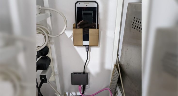Foto de um smartphone Pixel em um armário, conectado a um hub USB