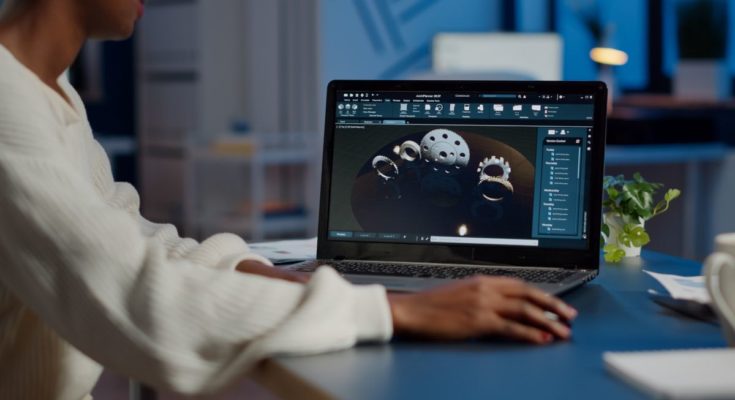 Engenheiro trabalhando em um laptop para fazer design industrial.