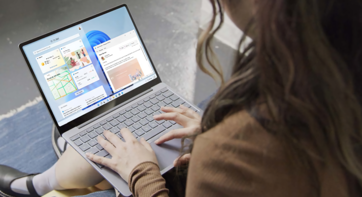 Garota digitando em um laptop Microsoft Surface Go 2