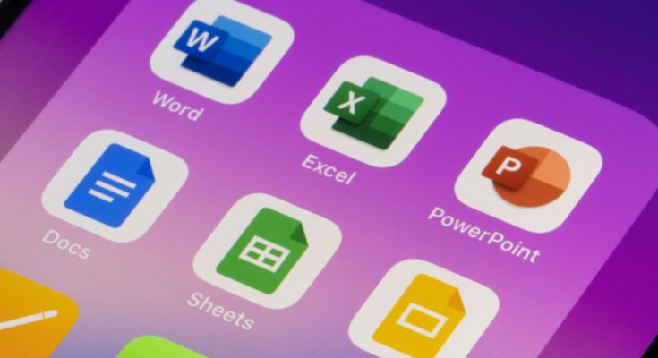 Close da tela de um smartphone mostrando aplicativos do Microsoft Office ao lado de aplicativos do Google.
