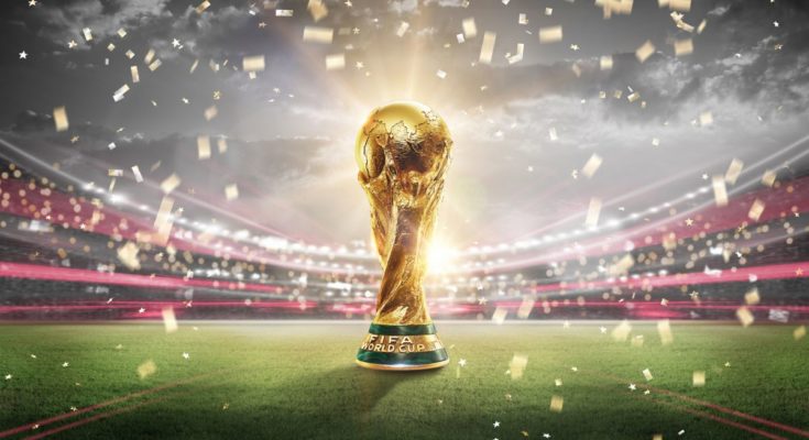O troféu da Copa do Mundo FIFA em um estádio cercado por confetes caindo.