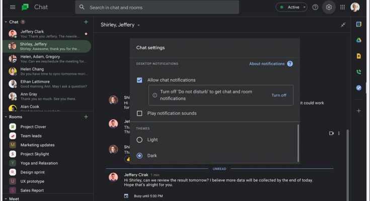 Para habilitar o modo escuro, clique em “Configurações” em qualquer um dos aplicativos da web do Google Chat. A partir daí, vá para “Configurações do tema”. Por fim, clique em “Modo escuro” para habilitar o novo modo visual que fará seus olhos agradecerem.