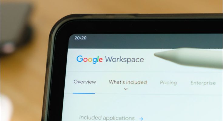 Logotipo do Google Workspace no canto da tela do tablet com caneta