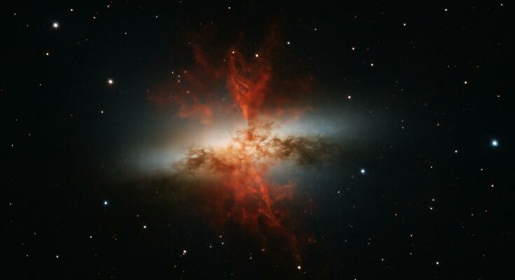 A galáxia M82, uma vibrante galáxia com intensa formação estelar, há muito tempo intriga astrônomos com suas emissões energéticas. Contudo, descobertas recentes, baseadas em anos de dados do Telescópio Espacial de Raios Gama Fermi e do sistema de telescópios Cherenkov VERITAS, traçam um retrato ainda mais dinâmico. Um novo estudo de pesquisadores do Observatório Astronômico de Pádua, da Universidade de Pádua e da Universidade de Tel Aviv, liderado por Massimo Persic, Riccardo Rando e Yoel Rephaeli, revelou uma poderosa fonte oculta de prótons no núcleo de M82, mostrando uma interação surpreendente entre raios cósmicos e radiação que ilumina o funcionamento interno da galáxia.