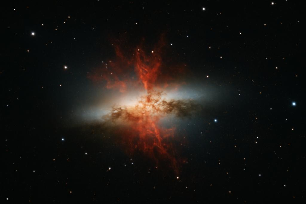 A galáxia M82, uma vibrante galáxia com intensa formação estelar, há muito tempo intriga astrônomos com suas emissões energéticas. Contudo, descobertas recentes, baseadas em anos de dados do Telescópio Espacial de Raios Gama Fermi e do sistema de telescópios Cherenkov VERITAS, traçam um retrato ainda mais dinâmico. Um novo estudo de pesquisadores do Observatório Astronômico de Pádua, da Universidade de Pádua e da Universidade de Tel Aviv, liderado por Massimo Persic, Riccardo Rando e Yoel Rephaeli, revelou uma poderosa fonte oculta de prótons no núcleo de M82, mostrando uma interação surpreendente entre raios cósmicos e radiação que ilumina o funcionamento interno da galáxia.