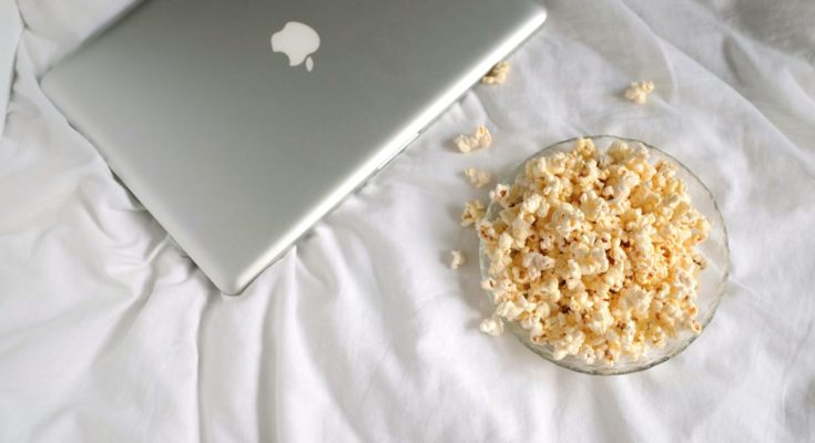 Um MacBook prateado fechado em cima de uma cama ao lado de uma tigela de pipoca.