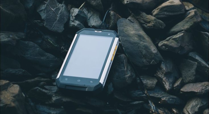 Smartphone robusto cercado por pedras