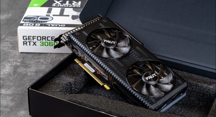 Uma placa de vídeo Palit NVIDIA Geforce RTX 3060 Ti em uma caixa aberta contra um fundo escuro.