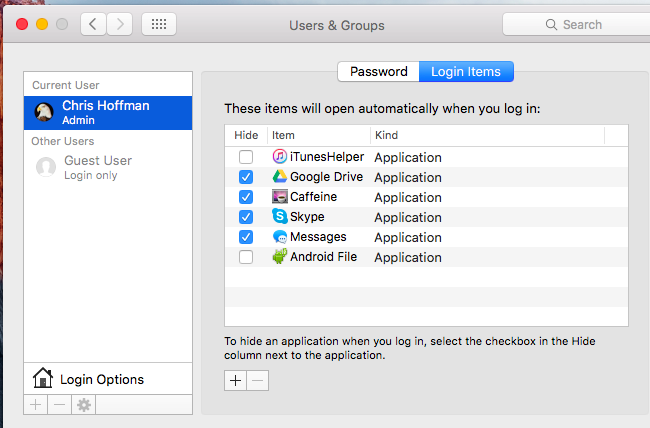 Selecione a conta de utilizador que deseja gerenciar – sua própria conta de utilizador, provavelmente – e clica na guia “Itens de login”. Os aplicações marcados nesta lista serão iniciados quando tu entrar, portanto, tu pode desmarcá-los se não quiser que iniciem automaticamente. tu também pode arrastar e soltar aplicações do dock ou da pasta aplicações para esta janela – se fizer isto, eles serão adicionados a esta lista e serão abertos automaticamente quando tu entrar.