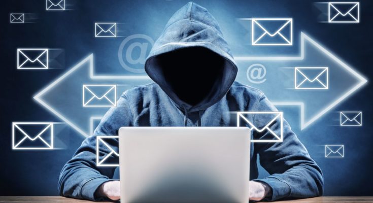 Pessoa com rosto obscurecido, usando um moletom com capuz e um laptop, com setas e ícones de e-mail flutuando ao seu redor.