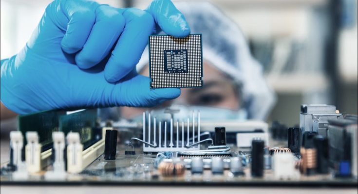 Um técnico segurando uma CPU sobre uma placa-mãe.
