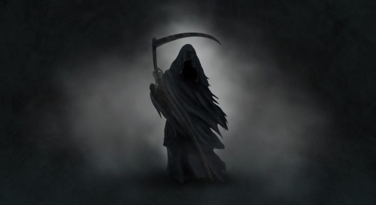 Silhueta do Ceifador contra uma nuvem de nevoeiro cinzento.