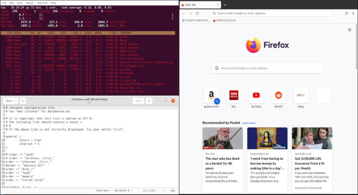 Gerenciadores de janelas lado a lado, como i3 e Xmonad, são uma espécie totalmente diferente de interface de usuário. Eles posicionam suas janelas para aproveitar ao máximo o espaço disponível em sua tela, ou telas. Abra uma única janela do terminal e ela ficará em tela inteira. Abra outro e eles ocuparão metade da tela cada um, de ponta a ponta, e colados um contra o outro.