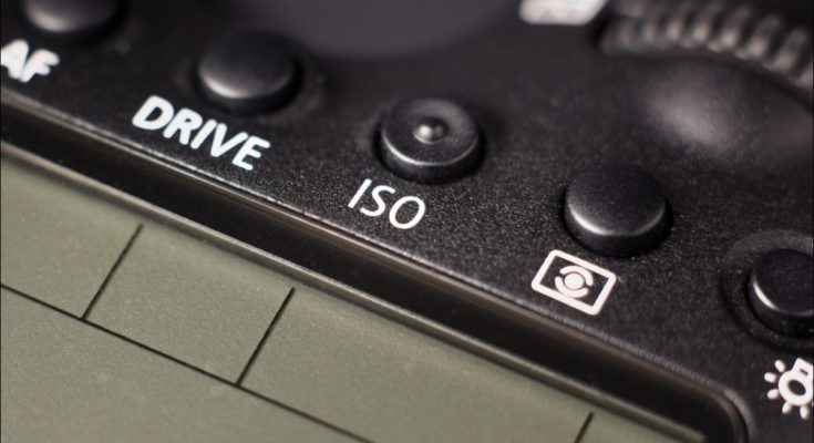 Close de uma tela de câmera Canon 6D mark2 com foco no botão ISO.