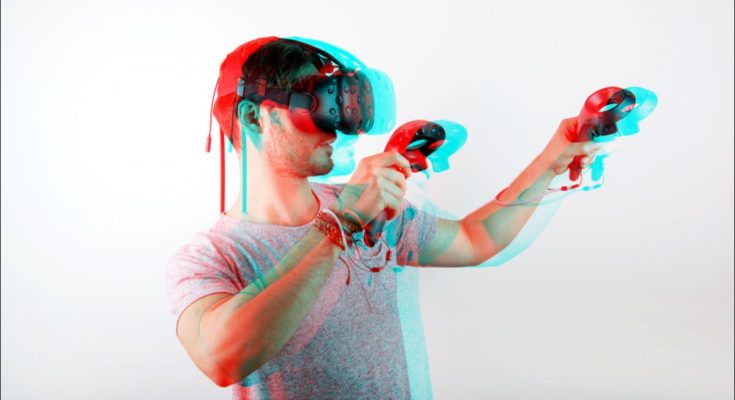 Homem usando um fone de ouvido VR, com um efeito anáglifo 3D "defeituoso".