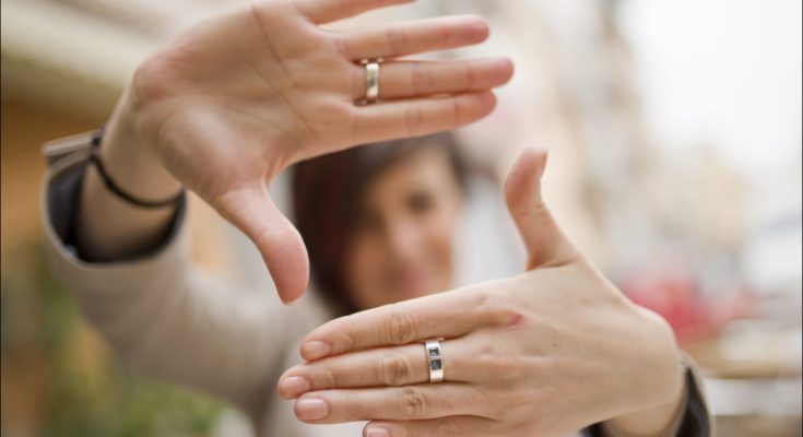 Mãos de mulher formando um quadro com o rosto fora de foco ao fundo.