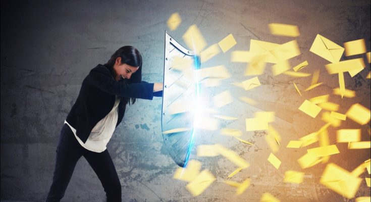 Foto de uma mulher lutando contra cartas de spam com um escudo