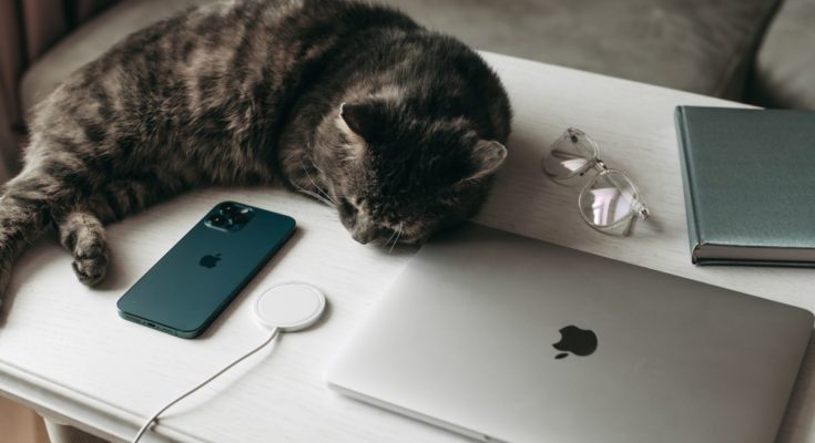 Um gato dormindo ao lado de um iPhone e um MacBook Pro.
