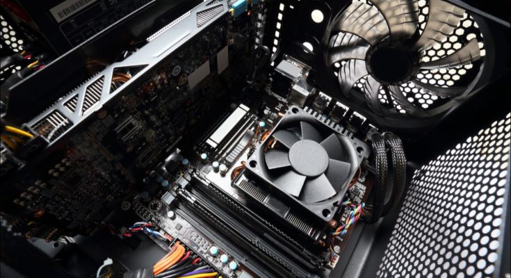 Uma placa-mãe, incluindo CPU e GPU, dentro de um computador desktop.