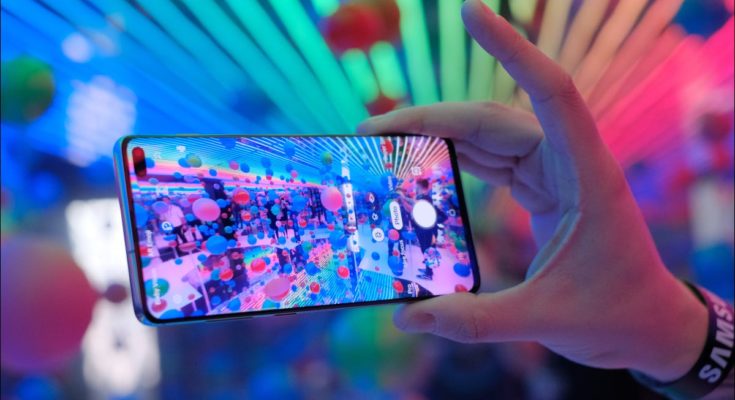 Mão segurando um Samsung Galaxy S10 com uma tela coloful na frente de luzes multicoloridas.