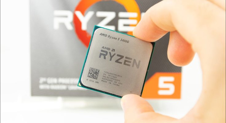 Close de uma CPU AMD Ryzen 5 3400G mantida entre os dedos de uma pessoa.