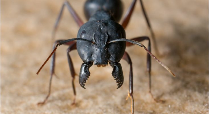 Imagem do close up de uma grande formiga preta com as mandíbulas abertas.