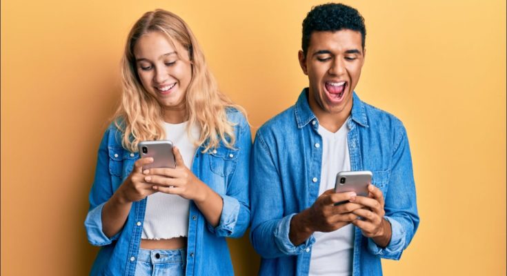 Um jovem casal ao lado um do outro enquanto sorrindo e usando seus smartphones.
