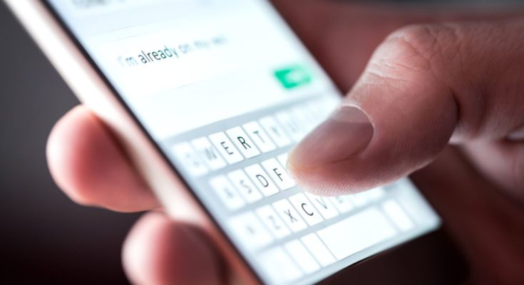 Close dos dedos de uma pessoa digitando em um teclado de smartphone de mensagem.