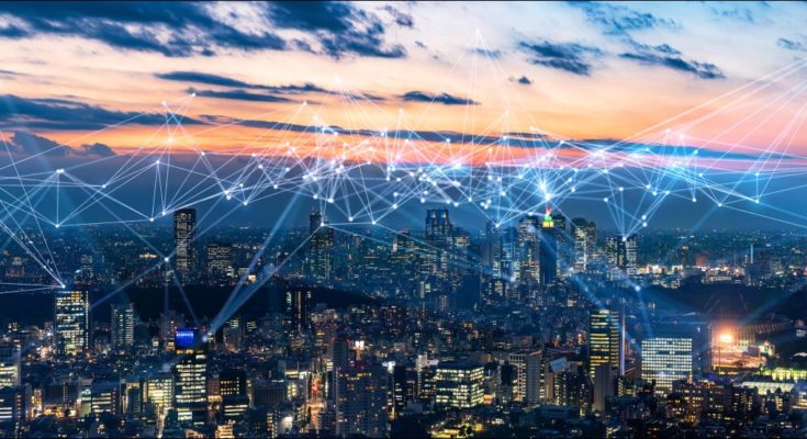 Uma paisagem urbana com conexões digitais desenhadas acima dela.