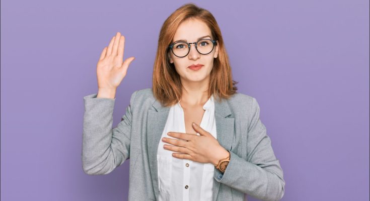 Mulher em trajes de negócios fazendo gesto de juramento.
