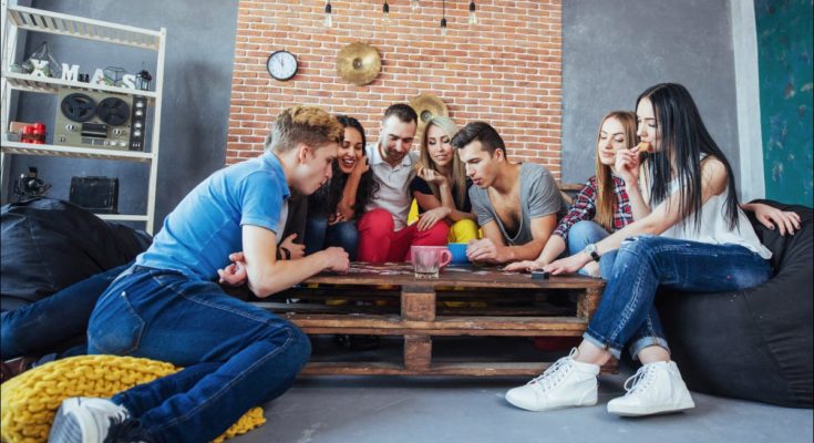 Grupo de jovens reunidos em torno de um jogo de tabuleiro.