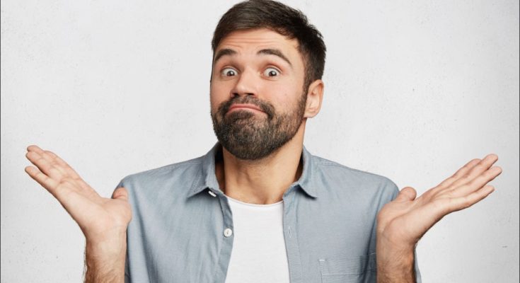 Homem barbudo encolhendo os ombros com as palmas das mãos para cima.